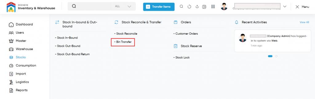 Path: Stocks > Stock Reconcile & Transfer > Bin Transfer