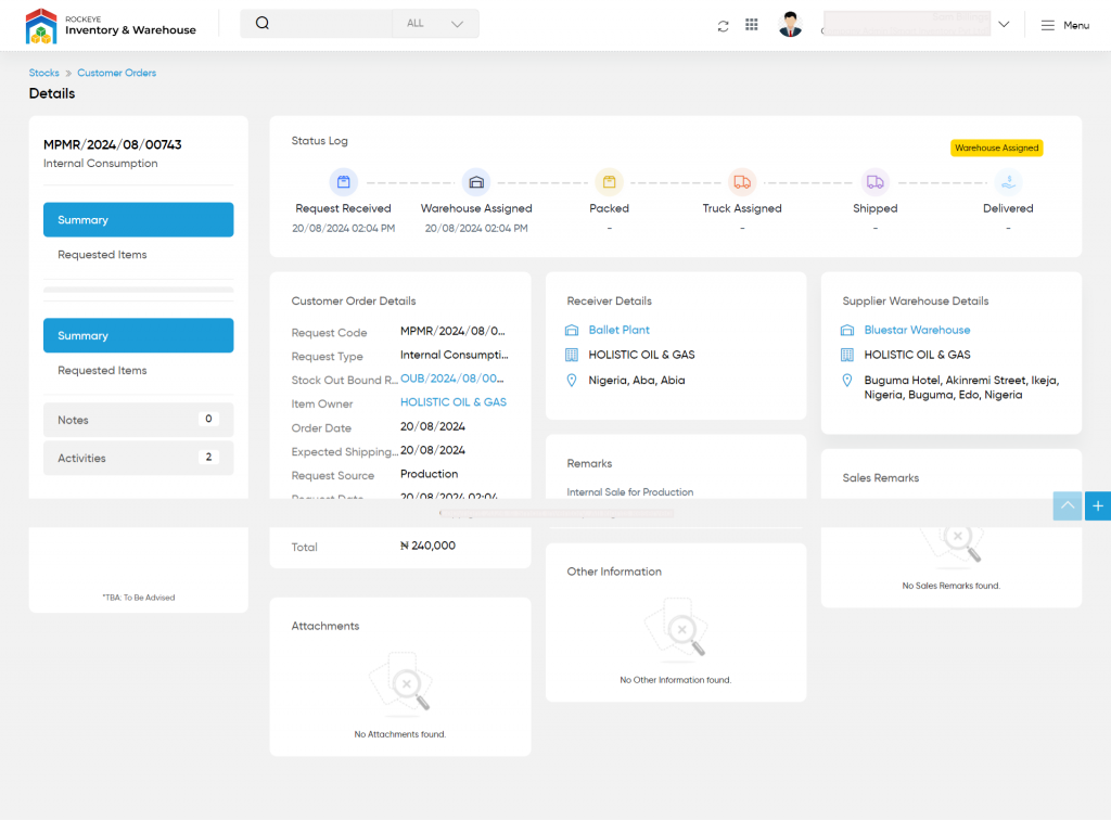 - By clicking on the “Status Log” button in the grid view listing, the admin will be able to view the status of the order as shown below. In the below example, the warehouse is assigned for the stock outbound for the order. For example, if the truck is assigned for the customer order, the path will be highlighted to the truck assigned.