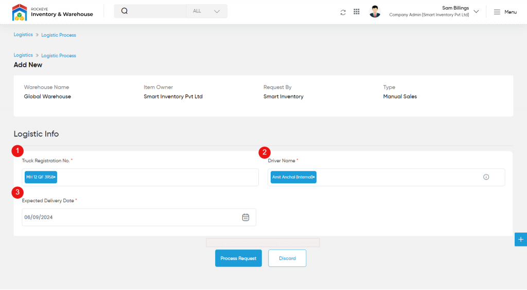 - Process Request: By clicking the process request button after specifying the above details truck and the driver will be successfully assigned for the delivery request and user will be navigated to the delivery status page.