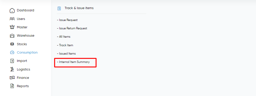 Path Consumption > Track & Issue Items > Internal Item Summary