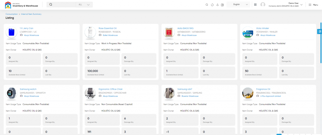 - View List of all the Warehouses, Item Owner, Item Name, Item Usage type, Available Qty, Assign Qty, Damaged Qty, and Lost Qty that are displayed by the Administrator. Admin will have an option to view the above-mentioned details. Admin will be able to search the Item using the search option this is provided on the list.