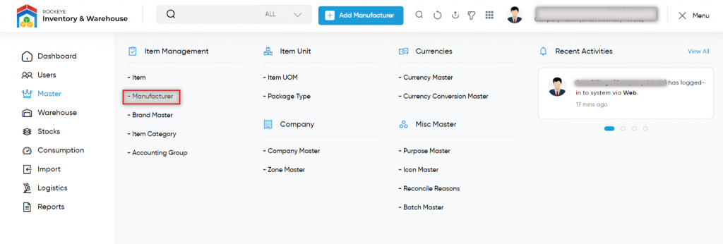 View a list of all the manufacturers that were previously added by the User. Users will have the option to add and update the manufacturers. Users will be able to search the manufacturers using the filter option provided on the list.