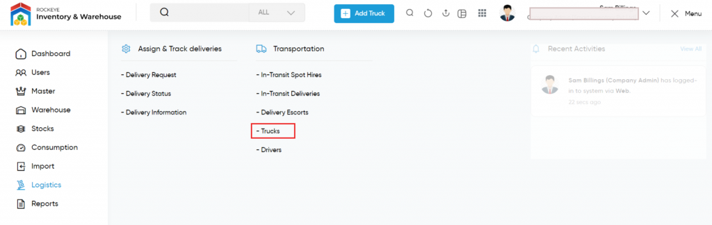 - By clicking on the “Activities” tab, the user will be able to view the truck activities as shown below